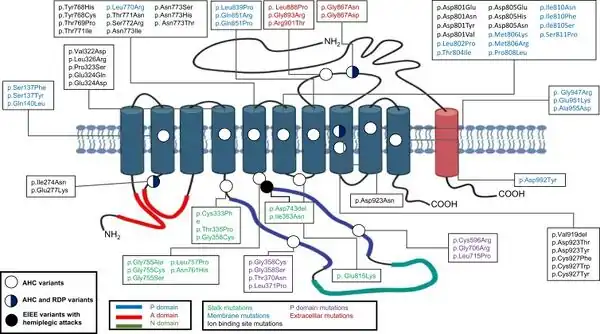 - 1 2 2.Heinzen EL, Swoboda KJ, Hitomi Y, et al. (2012). "De novo mutations in ATP1A3 cause alternating hemiplegia of childhood". Nat Genet. 44 (9): 1030–4. doi:10.1038/ng.2358. PMC 3442240. PMID 22842232.
