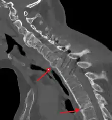Fracture of the T5 and C7 vertebra due to trauma in a person with ankylosing spondylitis as seen on a CT scan