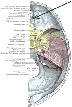 ![]() Base of the skull. Upper surface. (On the left, "Anterior ethmoidal foramen" is the 7th label from the right.) | |