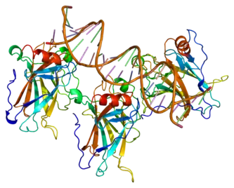 The p53 protein is a tumor-suppressing transcription factor (TF), which can recognize when there is an alteration in a cell's DNA caused by factors including chemical toxins, radiation, ultraviolet (UV) rays, and other damaging agents.[50] Crucially, p53 plays a role in determining whether the damaged genetic material in the cell can be repaired, or if the cell should be destroyed through apoptosis.[51][52] The individual topologically associating domains (TADs) target different genes and unique effector pathways. It has been observed that inactivating both of the TADs detrimentally affects the ability of p53 to suppress tumor growth and interact with target genes. When only one TAD is inactivated, p53 can still suppress specific tumors; however, it can no longer successfully engage in transactivation. The C-terminal domain (CTD) is an intrinsically disordered domain (IDD), which can take on different conformations depending on what it is binding with and is a location of many post-translational modifications, resulting in its ability to regulate p53 function depending on what it is bound to and what modifications are linked with the CTD. This domain also aids in the binding of the central DNA-binding domain (DBD) to specific DNA sequences; the CTD is a positive regulator of DNA binding and stabilizes the interaction of the DNA with the DBD.[50] p53 is unique as a transcription factor in that it can recognize and bind response elements (RE) in many different environments and doesn't need other transcription factors to cooperatively bind with it like many other TFs.[50]