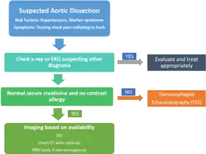 While a good history may be strongly suggestive, the diagnosis cannot always be made by history and physical signs alone. The diagnosis is confirmed by visualization of the intimal flap on diagnostic imaging; typically CT scan of the chest with contrast or transesophageal echocardiogram. The proximity of the aorta to the esophagus allows the use of higher-frequency ultrasound for better anatomical images. Other tests that may be used include an aortogram or magnetic resonance angiogram of the aorta.