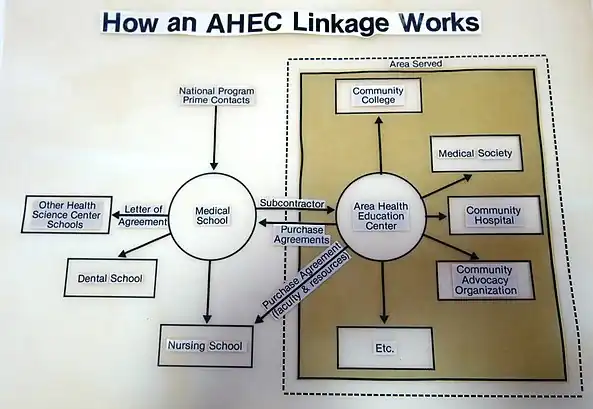 AHECs are nonprofit organizations strategically located within designated regions where health care and health care education needs are not adequately met. An AHEC works within its region to make health care education (including residency and student rotations) locally available, on the premise that health care workers are likely to remain in an area where they train.[3] An AHEC also works to support practicing professionals with continuing education programs and other support resources and to attract youth (particularly those from minority and medically underserved populations) to health care professions. An AHEC partners with community organizations and academic institutions to fulfill its mission.