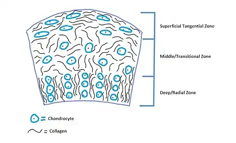 There are three structural zones in articular cartilage including a superficial tangential zone, a middle transitional zone and a deep zone. In the tangential zone, collagen fibers are aligned parallel to the surface and become gradually randomly aligned while moving into the deep zone. Collagen fibers in the superficial zone are aligned parallel to the surface in order to restrict shear stresses. Similarly, collagen fibers are aligned perpendicular to the surface in the deep zone in order to restrict compressive forces.[5] Between bone and the deep zone lies calcified cartilage. Cell arrangement also varies between the zones, in deeper zones chondrocytes are stacked into columns while in the superficial zones they are arranged randomly.[3] In the superficial regions the cells are also more elongated, while in deeper zones they are more spherical in nature.[5]