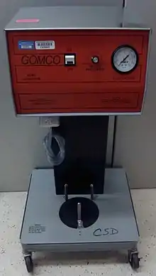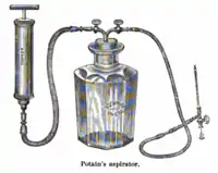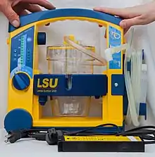 A medical aspirator is a suction machine used to remove mucus, blood, and other bodily fluids from a patient. They can be used during surgical procedures but an operating theater is generally equipped with a central system of vacuum tubes.[1] Most aspirators are therefore portable, for use in ambulances and nursing homes, and can run on AC/DC or battery power. They consist of a vacuum pump, a vacuum regulator and gauge, a collection canister, and sometimes a bacterial filter. Plastic tubing is used to continuously draw fluid into the collection canister.