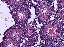 | Micrograph of an astroblastoma showing the characteristic nuclear pervivascular pseudorosette. H&E stain. | |