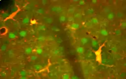 Astrocytes (red-yellow) among neurons (green) in the living cerebral cortex