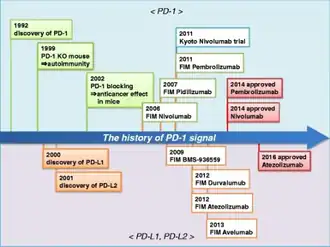 In April 2016, Roche announced that atezolizumab had been granted fast track status for lung cancer by the U.S. Food and Drug Administration (FDA).[12] Atezolizumab is the first PD-L1 inhibitor approved by the U.S. Food and Drug Administration (FDA).[13]