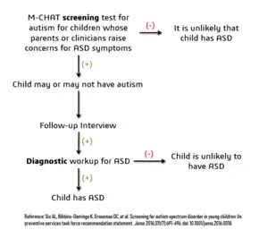 99. 1 2 3 4 5 6 7 Siu, Albert L.; US Preventive Services Task Force (USPSTF); Bibbins-Domingo, Kirsten; Grossman, David C.; Baumann, Linda Ciofu; Davidson, Karina W.; Ebell, Mark; García, Francisco A. R.; Gillman, Matthew; Herzstein, Jessica; Kemper, Alex R. (16 February 2016). "Screening for Autism Spectrum Disorder in Young Children: US Preventive Services Task Force Recommendation Statement". JAMA. 315 (7): 691–696. doi:10.1001/jama.2016.0018. ISSN 1538-3598. PMID 26881372.