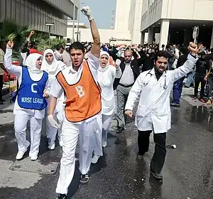 In March and April 2011, twenty health workers were arrested on a variety of felony charges for their actions during the protests, while an additional twenty-eight were arrested for misdemeanors.[1] The total number of arrested health workers exceeded seventy.[8] Dr. Ali Al-Ekri was arrested while performing surgery at Salmaniya Medical Complex.[9]