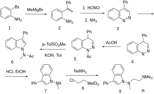 - ↑ US 4204998, Schatz F, Stammbach C, Thiele K, Theodor W. Wagner-Jauregg, Zirngibl L, Fischer J, Jahn U, "N-Amino indole derivatives having pharmacological activity", issued 27 May 1980, assigned to Siegfried AG