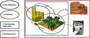 The climate impact of bioenergy varies considerably depending on where biomass feedstocks come from and how they are grown.[3] For example, burning wood for energy releases carbon dioxide. Those emissions can be significantly offset if the trees that were harvested are replaced by new trees in a well-managed forest, as the new trees will remove carbon dioxide from the air as they grow.[4] However, the farming of biomass feedstocks can displace natural ecosystems, degrade soils and take land out of food production. It may also consume water for irrigation and fertilisers.[5][6]