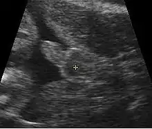 A gestational sac can be reliably seen on transvaginal ultrasound by 5 weeks' gestational age (approximately 3 weeks after ovulation). The embryo should be seen by the time the gestational sac measures 25 mm, about five and a half weeks.[10] The heartbeat is usually seen on transvaginal ultrasound by the time the embryo measures 5 mm, but may not be visible until the embryo reaches 19 mm, around 7 weeks' gestational age.[5][11][12] Coincidentally, most miscarriages also happen by 7 weeks' gestation. The rate of miscarriage, especially threatened miscarriage, drops significantly after normal heartbeat is detected, and after 13 weeks.[13]