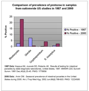 - Prevalence over Time: A 1989 study of the prevalence of Blastocystis in the United States found an infection rate of 2.6% in samples submitted from all 48 states.[49] The study was part of the CDC's MMWR Report. A more recent study, in 2006, found an infection rate of 23% in samples submitted from all 48 states. However, the more recent study was performed by a private laboratory located in the Western US, and emphasized samples from Western states, which have previously been reported to have a higher infection rate.[49]