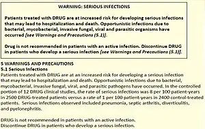 - 1 2 "Warnings and Precautions, Contraindications, and Boxed Warning Sections of Labeling for Human Prescription Drug and Biological Products — Content and Format" (PDF). Guidance for industry. Even in the context of clinical research, human subjects are often not informed about the risks included in boxed warnings for drugs they are being given. For protocols involving drugs with boxed warnings, 63% of consent forms did not disclose 1 or more boxed warning risks. Warnings and precautions, contraindications, and boxed warning sections of labeling for human prescription drug and biological products—content and format. U.S. Food and Drug Administration. Retrieved February 21, 2010.