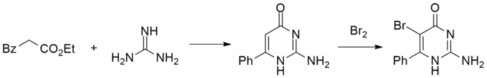 For the first step, the dianion from malonic acid half-ester is formed by treatment with butyllithium. Acylation of the anion with benzoyl chloride proceeds at the carbanion, which is more nucleophilic (because of the higher charge density). This tricarbonyl compound decarboxylates on acidification to the β-ketoester. Condensation with guanidine leads to the pyrimidone. NBS mediated bromination then gives bropirimine.