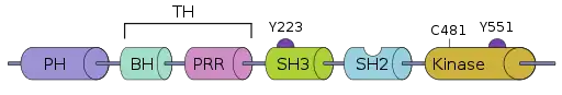 BTK contains five different protein interaction domains. These domains include an amino terminal pleckstrin homology (PH) domain, a proline-rich TEC homology (TH) domain, SRC homology (SH) domains SH2 and SH3, as well as a kinase domain with enzymatic activity.[1]