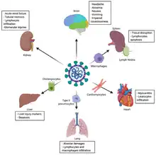 The virus can cause acute myocardial injury and chronic damage to the cardiovascular system.[64] An acute cardiac injury was found in 12% of infected people admitted to the hospital in Wuhan, China,[65] and is more frequent in severe disease.[66] Rates of cardiovascular symptoms are high, owing to the systemic inflammatory response and immune system disorders during disease progression, but acute myocardial injuries may also be related to ACE2 receptors in the heart.[64] ACE2 receptors are highly expressed in the heart and are involved in heart function.[64][67] A high incidence of thrombosis and venous thromboembolism have been found in people transferred to Intensive care units (ICU) with COVID‑19 infections, and may be related to poor prognosis.[68] Blood vessel dysfunction and clot formation (as suggested by high D-dimer levels caused by blood clots) are thought to play a significant role in mortality, incidences of clots leading to pulmonary embolisms, and ischaemic events within the brain have been noted as complications leading to death in people infected with SARS-CoV-2. Infection appears to set off a chain of vasoconstrictive responses within the body, constriction of blood vessels within the pulmonary circulation has also been posited as a mechanism in which oxygenation decreases alongside the presentation of viral pneumonia.[69] Furthermore, microvascular (arterioles and capillaries) blood vessel damage has been reported in a small number of tissue samples of the brains – without detected SARS-CoV-2 – and the olfactory bulbs from those who have died from COVID‑19.[70][71][72] COVID‑19 was also found to cause substantial – including morphological and mechanical – changes to blood cells – such as increased sizes – sometimes persisting for months after hospital discharge.[73][74]