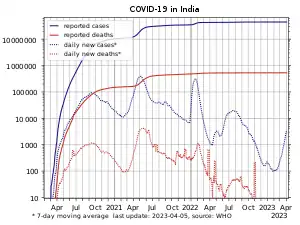 The COVID-19 pandemic in India is a part of the worldwide pandemic of coronavirus disease 2019 (COVID-19) caused by severe acute respiratory syndrome coronavirus 2 (SARS-CoV-2). As of 12 April 2024, according to Indian government figures, India has the second-highest number of confirmed cases in the world (after the United States of America) with 45,034,360[4] reported cases of COVID-19 infection and the third-highest number of COVID-19 deaths (after the United States and Brazil) at 533,552[4] deaths.[6][7] In October 2021, the World Health Organization estimated 4.7 million excess deaths, both directly and indirectly related to COVID-19 to have taken place in India.[8][9]