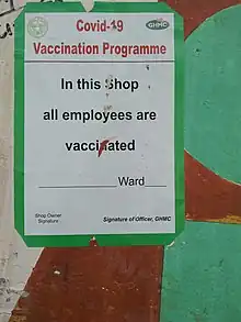 Administratively, India began preparing to vaccinate its population in April 2020 with the setting up a Vaccine Task Force.[165] Following this the National Expert Group on Vaccine Administration for COVID-19 (NEGVAC) was formed,[166] and in October 2020 states were asked to set up state level mechanisms for the COVID-19 vaccine programme,[167] and prepare cold chains points.[168][169] A communication strategy for the vaccination programme was also revealed by the health ministry in January 2021, targeting issues such as vaccine eagerness and hesitancy.[170]