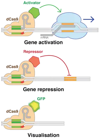 {{cite journal}}: Check|pmc=value (help) - ↑ Dominguez AA, Lim WA, Qi LS (January 2016). "Beyond editing: repurposing CRISPR-Cas9 for precision genome regulation and interrogation". Nature Reviews. Molecular Cell Biology. 17 (1): 5–15. doi:10.1038/nrm.2015.2. PMC 4922510. PMID 26670017.