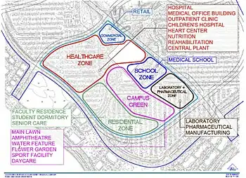 The Medical Center will be a 730,000 square foot teaching hospital with capacity for trauma care. It will have 350 beds, including 30 ICU beds with an additional 30 beds that can be flexed up to ICU level. It will also have 39 ER beds and 2 trauma care rooms with their own CT scan rooms. It is planned to be fourteen stories tall with state-of-art design for efficient and quality patient care.[13]