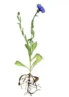 Centaurea cyanus is an annual plant growing to 40–90 cm tall, with grey-green branched stems. The leaves are lanceolate and 1–4 cm long. The flowers are most commonly an intense blue colour and arranged in flowerheads (capitula) of 1.5–3 cm diameter, with a ring of a few large, spreading ray florets surrounding a central cluster of disc florets. The blue pigment is protocyanin, which in roses is red.[4] Fruits are approx. 3.5 mm long with 2–3 mm long pappus bristles.[5] It flowers all summer.[6]