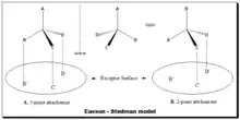 Easson and Stedman[30] (1933) advanced a drug-receptor interaction model to account for the differential pharmacodynamic activity between enantiomeric pairs. In this model the more active enantiomer (the eutomer) take part in a minimum of three simultaneous intermolecular interactions with the receptor surface (good fit), Figure. A., where as the less active enantiomer (distomer) interacts at two sites only (bad fit), Figure B. [Refer image for Figure: Easson-Stedman model]. Thus the "fit" of the individual enantiomers to the receptor site differs, as does the energy of interaction. This is a simplistic model but used to explain the biological discrimination between enantiomeric pairs.