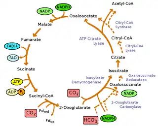 The reactions of reversal of the oxidative tricarboxylic acid cycle are catalyzed by four enzymes:[9]
