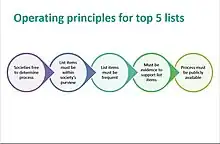 List items recommend practices to be avoided and typically begin with the word "Don't" or "Avoid"; for example, one of the recommendations released in the first wave of the campaign was Don't order screening chest X-rays and ECGs for asymptomatic or low risk outpatients.[20] National specialty societies are free to determine the process for generating their lists, as long as they are done in accordance with the following principles:[1]
