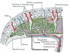 Vasculature of the placenta, with a chorionic artery labeled in .