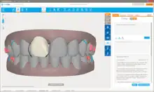 A computer graphic representation of the projected teeth movements, created in the software program ClinCheck, is provided to the doctor and patient for approval or modification before aligners are manufactured.[9][11][13] The aligners are modeled using CAD/CAM (computer-aided-design and computer-aided-manufacturing) software and manufactured using a rapid prototyping technique called stereolithography.[10][11] The molds for the aligners are built in layers using a photo-sensitive liquid resin that cures into a hard plastic when exposed to a laser.[10] The aligners are made from an elastic thermoplastic material that applies pressure to the teeth to move into the aligner's position.[13][15][16] Patients that need a tooth rotated or pulled down may have a small, tooth-colored[17] composite attachment bonded onto certain teeth.[13] Since the form-fitted plastic used in clear aligners is not as rigid as the metal used in traditional braces, sometimes the flexibility in the materials need to be compensated in the areas that require movement. Alternatively, attachments may be used to facilitate movement by changing the shape of the tooth.[18] More attachments can make the aligners less aesthetically pleasing.[11] Interproximal reduction (IPR, also called reproximation or, colloquially, filing or drilling) is sometimes used at the contacts between teeth to allow for a better fit.[19][20]