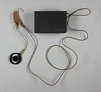 ALDs come in many forms, such as neckloops,[51] pens,[52] and specialist battery pack covers.[53] Modern ALDs are usually able to receive sound from any Bluetooth device, including phones and computers, before transmitting it wirelessly to the audio processor. Most cochlear implants are also compatible with older ALD technology, such as a telecoil.[54]