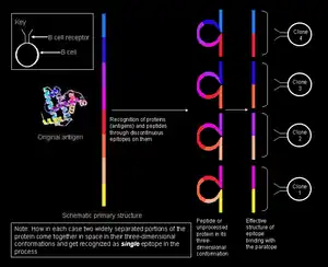 Proteins are composed of repeating nitrogen-containing subunits called amino acids that in nature do not exist as straight chains but as folded whorls with complex loops. The latter is known as the tertiary structure of a protein. So, whenever a receptor interacts with an undigested antigen, the surface amino acids that come in contact may not be continuous with each other if the protein is unwound. Such discontinuous amino acids that come together in three-dimensional conformation and interact with the receptor's paratope are called conformational epitopes. In contrast, if the antigen is digested, small segments called peptides are formed, which bind with major histocompatibility complex molecules, and then later with T cell receptors through amino acids that are continuous in a line. These are known as linear epitopes.[1]