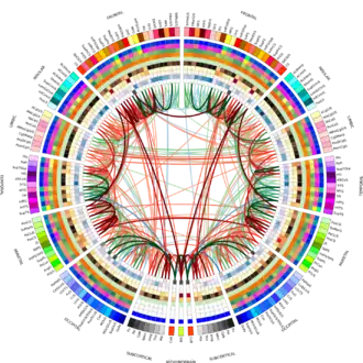 With the recent concerted push to map all of the human brain and its connections,[8][9] it has become increasingly important to find ways to graphically represent the large amounts of data involved in connectomics. Most other representations of the connectome use 3 dimensions, and therefore require an interactive graphical user interface.[1] The connectogram can display 83 cortical regions within each hemisphere, and visually display which areas are structurally connected, all on a flat surface. It is therefore conveniently filed in patient records, or to display in print. The graphs were originally developed using the visualization tool called Circos.[10][11]