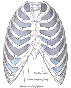 The costodiaphragmatic recess, also called the costophrenic recess or phrenicocostal sinus,[1] is the posterolateral fringe of the pleural space, a potential space around the lung inside the pleural cavity. It is located at the acutely angled junction ("reflection") between the costal and diaphragmatic parietal pleurae, and is interpreted two-dimensionally on plain X-rays as the costophrenic angle. It measures approximately 5 cm (2.0 in) vertically and extends from the eighth to the tenth rib along the mid-axillary line.