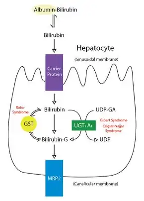 It is caused by abnormalities in the gene coding for uridine diphosphoglucuronate glucuronosyltransferase (UGT1A1). UGT1A1 normally catalyzes the conjugation of bilirubin and glucuronic acid within hepatocytes. Conjugated bilirubin is more water-soluble and is excreted in bile.