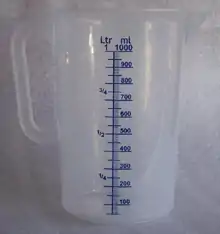 ![]() A measuring cup holding 1000 cubic centimetres, that is one litre (1 L) or 1000 millilitres (1000 mL) | |