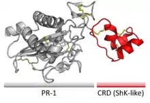 CRISPs contain two domains joined by a hinge region. The larger domain is a CAP-like 'Pathogenesis-related 1' domain (PR-1), followed by the smaller ShK-like 'Cysteine-Rich Domain' (CRD).[1]