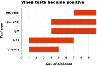 These laboratory tests are only of diagnostic value during the acute phase of the illness with the exception of serology. Tests for dengue virus-specific antibodies, types IgG and IgM, can be useful in confirming a diagnosis in the later stages of the infection. Both IgG and IgM are produced after 5–7 days. The highest levels (titres) of IgM are detected following a primary infection, but IgM is also produced in reinfection. IgM becomes undetectable 30–90 days after a primary infection, but earlier following re-infections. IgG, by contrast, remains detectable for over 60 years and, in the absence of symptoms, is a useful indicator of past infection. After a primary infection, IgG reaches peak levels in the blood after 14–21 days. In subsequent re-infections, levels peak earlier and the titres are usually higher. Both IgG and IgM provide protective immunity to the infecting serotype of the virus.[23][26][33] In testing for IgG and IgM antibodies there may be cross-reactivity with other flaviviruses which may result in a false positive after recent infections or vaccinations with yellow fever virus or Japanese encephalitis.[25] The detection of IgG alone is not considered diagnostic unless blood samples are collected 14 days apart and a greater than fourfold increase in levels of specific IgG is detected. In a person with symptoms, the detection of IgM is considered diagnostic.[23]