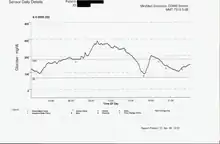 Example 8 shows a data plot from a continuous glucose prediction system (CGPS). This plot shows the blood sugar levels between meals and also during the night, when other BG testing methods using a finger prick sample would typically miss the data available between samples. CGPS is a new technology that it intended to give immediate feedback between finger sticks and also predict what may be happening soon to give the person with diabetes a chance to correct a high or low blood sugar condition before it becomes urgent.
