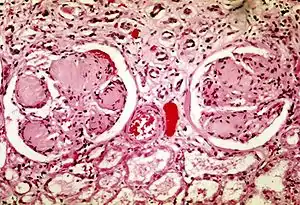| Two glomeruli in diabetic kidney disease: the acellular light purple areas within the capillary tufts are the destructive mesangial matrix deposits. | |