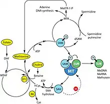 - ↑ Caudill MA, Wang JC, Melnyk S, Pogribny IP, Jernigan S, Collins MD, et al. (November 2001). "Intracellular S-adenosylhomocysteine concentrations predict global DNA hypomethylation in tissues of methyl-deficient cystathionine beta-synthase heterozygous mice". The Journal of Nutrition. 131 (11): 2811–2818. doi:10.1093/jn/131.11.2811. PMID 11694601.