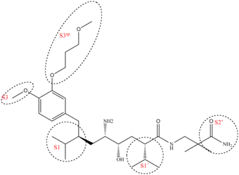 Example of binding to the renin inhibitor: Aliskiren is a peptide-like renin inhibitor and, unlike most, it is rather hydrophilic. It blocks the catalytic function of the enzyme by occupying the S3 to S2′ pockets, except the S2 pocket. Aliskiren also binds to the S3sp subpocket and because that pocket is distinct for renin, aliskiren does not inhibit other aspartic proteases, such as cathepsin D and pepsin.[46] The side chain of aliskiren binds the S3sp subpocket ideally, and leads to its quality as an inhibitor of human renin.[11] The hydroxyl group in aliskiren forms a hydrogen bond with both oxygen atoms of the Asp32. The amine group forms a hydrogen bond with the carboxylic acid group of Gly217 and the oxygen atom of the Asp32. The methoxy group on the aromatic ring fills the S3 pocket and may possibly form a hydrogen bond with a secondary amine group of Tyr14. The amide group forms a hydrogen bond with a secondary amine group of Ser76.[47] The S1 and S1′ pockets are occupied by the two propyl groups in positions P1 and P1′.[45] The terminal amide in position P2′ anchors the amide tail in the active site by forming a hydrogen bond with Arg74 in the S2′ pocket.[49]