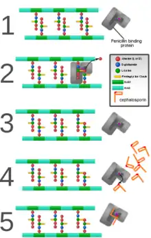 Cephalosporins must get through the bacterial cell wall in order to reach the target PBP. In comparison, it is easier to penetrate the cell wall of gram-positive bacteria than the cell wall of gram-negative bacteria. The cell wall structure of gram-positive bacteria is made routinely up by peptidoglycan which allows the passage of cephalosporin-sized molecules. The cell wall structure of gram-negative bacteria is more complex, composed of polysaccharides, lipids and proteins, and is harder to penetrate. Particles get through the outer membrane through water-filled channels, or porins, which are trans membrane proteins.[15] During exposure to cephalosporins the bacteria can form resistance by itself or as selection of the next generation of bacteria after reproducing itself, by mutation.[16] Bacteria species such as pneumococci and meningococci can acquire exogenous genetic material, and incorporate it into their own chromosomes which leads to antimicrobial resistance.[17] In that manner the target PBP can be altered to have their attraction for cephalosporins and other β-lactam antibiotics lowered.[18][19] The bacteria can also replace the PBP that is vulnerable to Beta-lactam antibiotics with PBP that is less vulnerable.[20] β-lactam antibiotics can be inactivated by many types of β-lactamases, which are produced by bacteria. The enzymes hydrolyze the bond between the carbon and nitrogen atom of the β-lactam ring. There are many beta lactamases which vary in substrate specificity and host range.[21][22] The enzymes active site is easily regenerated hydrolytically so it is re-usable many times, in that way can a comparatively small amount of beta-lactamases destroy a large amount of drug. Gram-positive bacteria, such as a staphylococci, have a high release of beta-lactamases into their extracellular space, where they meet the drug outside the cell wall. Gram-negative bacteria on the other hand follow a more conservative course. They secrete their beta-lactamases into the periplasmic space between the inner and outer membrane so they can't easily escape into the extracellular space, and don't have to be biosynthesized in high quantities.[1]