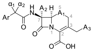 The molecular structure of cephalosporin can be altered in various ways to improve in vitro stability, anti-bacterial activity and resistance against β-lactamases. In the acidic conditions of the stomach, in vitro stability can be enhanced by the addition of an amino and a hydrogen to positions α1 and α2 of the cephalosporin structure. This results in a basic compound, an ammonium ion that is protonated in said conditions, giving us a more stable β-lactam which leads to an orally active drug. Anti-bacterial activity can be enhanced if A2 is an alkoxy group instead of a hydrogen. The 7-amino group is crucial for anti-bacterial activity. In some cases, adding a methoxy group in position A2, cephalosporin stability is enhanced toward β-lactamases. In position A1, sulfur and oxygen can be placed in the ring. Sulfur shows better anti-bacterial activity, but oxygen shows better stability towards β-lactamases. In position C6, hydrogen is crucial for biological activity. In position A3, anti-bacterial activity is greater when A3 is a 5-membered heterocycle instead of a 6-membered one. In position α1 and α2, the L-isomer is 30–40 times more stable towards β-lactamase than the D-isomer. Stability toward β-lactamase can be increased around 100-fold with the addition of methoxyoxime. Z-oxime is nearly 20,000-fold more stable than the E-oxime.[1]