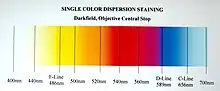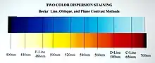 The dispersion staining is an analytical technique used in light microscopy that takes advantage of the differences in the dispersion curve of the refractive index of an unknown material relative to a standard material with a known dispersion curve to identify or characterize that unknown material. These differences become manifest as a color when the two dispersion curves intersect for some visible wavelength. This is an optical staining technique and requires no stains or dyes to produce the color. Its primary use today is in the confirmation of the presence of asbestos in construction materials[1][2][3] but it has many other applications.[4][5][6][7][8][9]