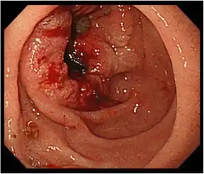 Endoscopic image of adenocarcinoma of duodenum seen in the post-bulbar duodenum