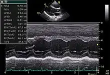 Echocardiography has become routinely used in the diagnosis, management, and follow-up of people with any suspected or known heart diseases.[3] It is one of the most widely used diagnostic imaging modality in cardiology.[3] It can be used to measure the size and shape of the heart and its chambers, pumping capacity, and the location and extent of any tissue damage, assessment of valves and cardiac masses.[3] An echocardiogram can also give physicians other estimates of heart function, such as a calculation of the cardiac output, ejection fraction, and diastolic function (how well the heart relaxes).[3] Echocardiography is an important tool in assessing wall motion abnormality in patients with suspected cardiac disease. It is a tool which helps in reaching an early diagnosis of myocardial infarction showing regional wall motion abnormality of the heart. Also, it is important in treatment and followup in patients with heart failure, by assessing ejection fraction.[4][5]