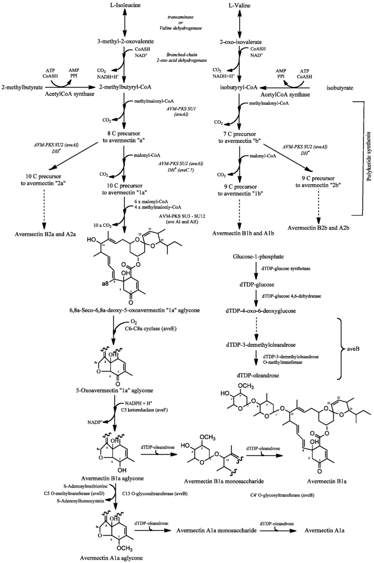 Avermectin biosynthesis is classified into three stages: the formation of the polyketide-derived initial aglycone, modification of the initial aglycone to produce avermectin aglycones, and glycosylation of avermectin aglycones to generate avermectins.[11]