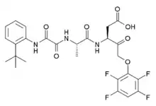 - ↑ Haddad JJ (September 2013). "Current opinion on 3-[2-[(2-tert-butyl-phenylaminooxalyl)-amino]-propionylamino]- 4-oxo-5-(2,3,5,6-tetrafluoro-phenoxy)-pentanoic acid, an investigational drug targeting caspases and caspase-like proteases: the clinical trials in sight and recent anti-inflammatory advances". Recent Patents on Inflammation & Allergy Drug Discovery. 7 (3): 229–58. doi:10.2174/1872213X113079990017. PMID 23859695.